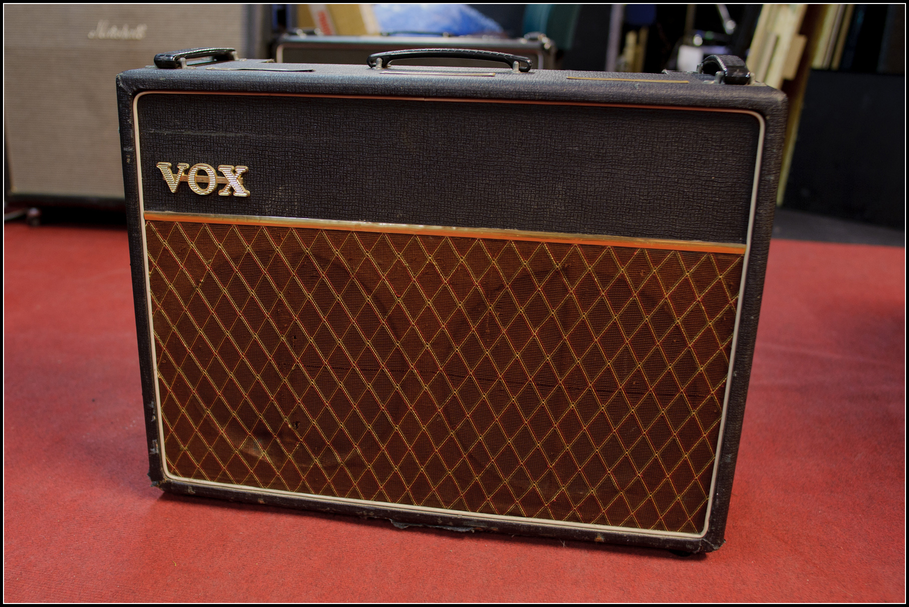 Vox AC30 combo from 1964. Six inputs, three channels: vib-trem, normal and brilliant. This one is a Top Boost model with more gain available than non Top Boost models have. This amp came from England from a really nice gentleman. The back panel has three holes: a previous owner had extra speaker jacks in there, but I removed them right away. The holes remain though. The electrolytic caps and some worn-out/drifted components have been replaced and the amp has otherwise been fully serviced in March 2012. Also, during the overhaul a regular 6.3mm jack was installed into one of the back panel holes so that any footswitch can be used to toggle the vibrato/tremolo on/off.